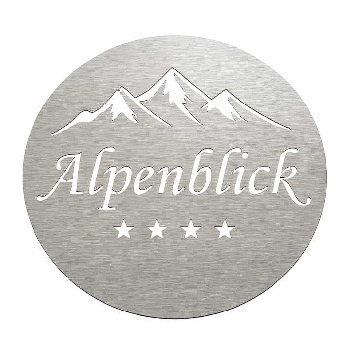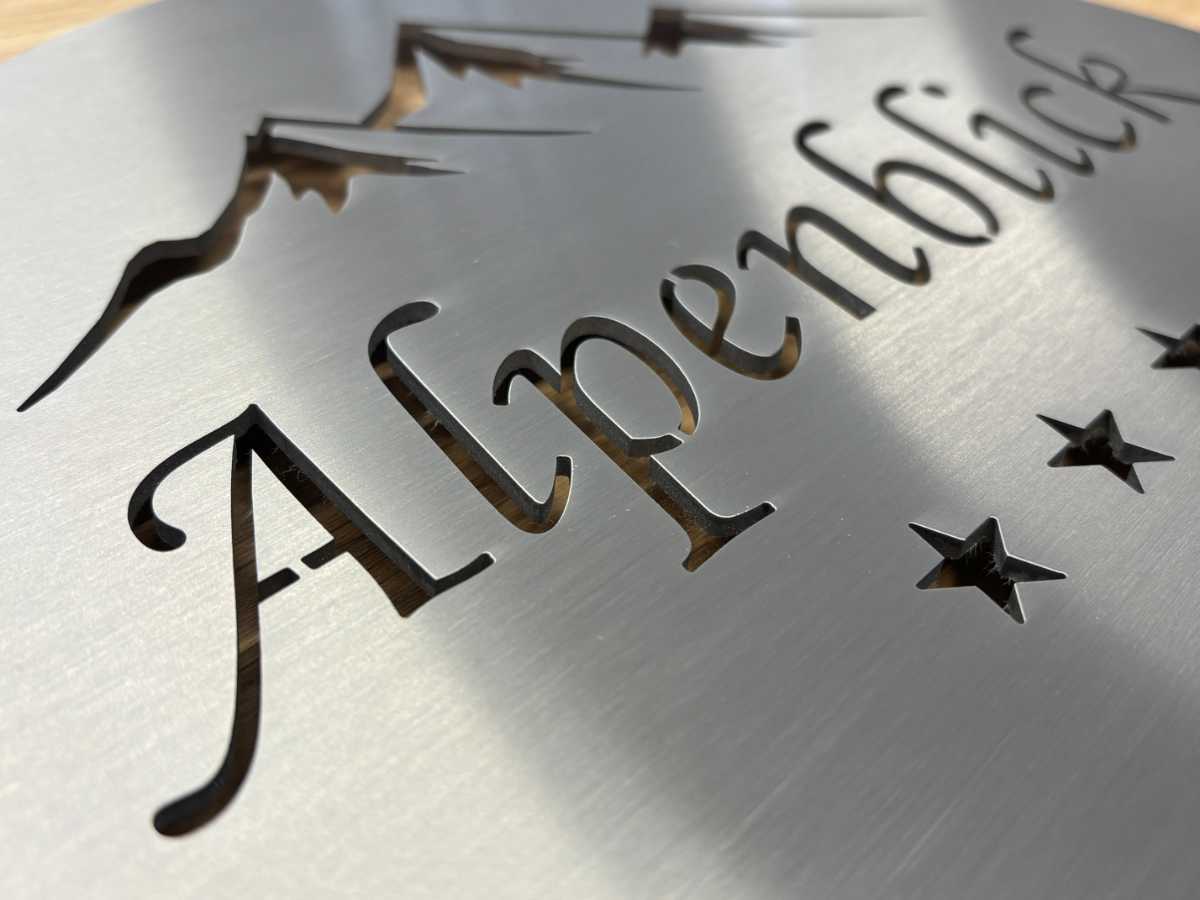 Im Gegensatz zu gravierten oder gedruckten Schildern werden bei diesem Modell Schriftzüge und Logos per Wasserstrahlschneiden direkt aus dem Edelstahlblech ausgeschnitten.