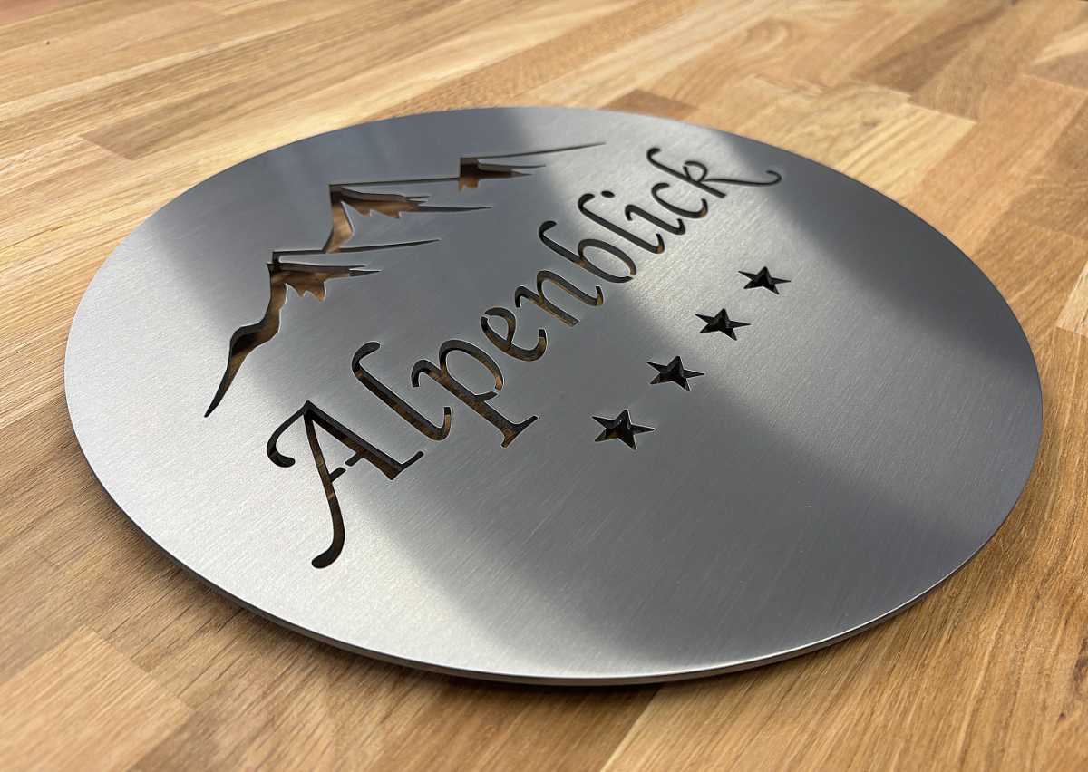 Firmenschild Edelstahl Ø 300 mm rund – individuell per Wasserstrahl ausgeschnitten