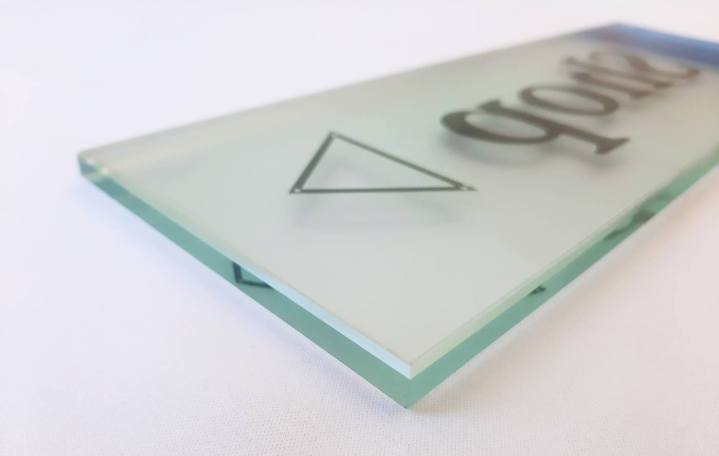 Text und Logo drucken wir im 4-farbigen Digitaldruck spiegelverkehrt auf transparente Hochleistungsfolie. Anschließend wird die Folie rückseitig auf das Glas geklebt und mit einer Glasdekorfolie (Sandstrahleffekt) veredelt - für eine brilliante Optik mit Tiefenwirkung.
