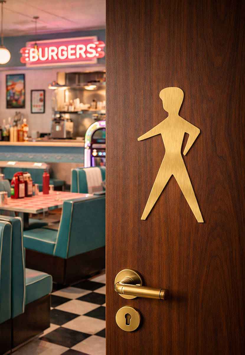 Die klaren Symbole gewährleisten eine sofort verständliche Orientierung, während die hochwertige Ausführung besonders in anspruchsvollen Umgebungen wie Gastronomie, Hotels oder Büros zur Geltung kommt.